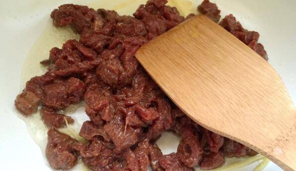 5、放进腌制好的牛肉,大火快速翻炒,炒至牛肉变色,盛出备用。