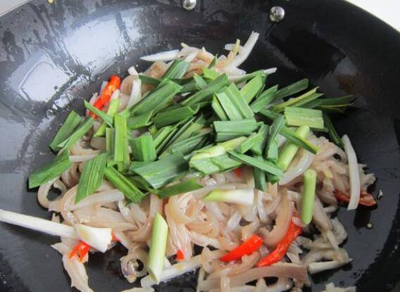 5、加蒜苗少许盐一起翻炒,加味级鲜。