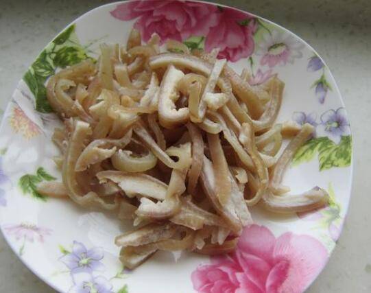 材料:酸菜400克、卤肉皮200克、植物油适量、盐适量、小米椒4个、生抽5克。