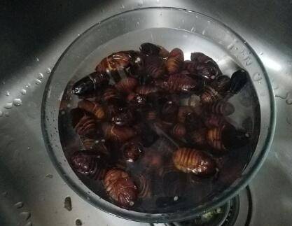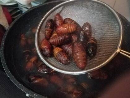 2、准备一锅清水,大火烧开,倒入蚕蛹,用水轻轻的焯一下,大约2-3分钟,关火沥水捞出,大碗装好备用。