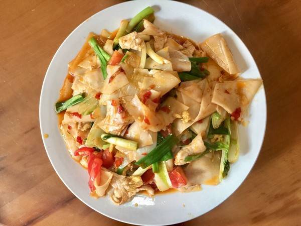 8、待饵块炒软放入葱和肉片继续翻炒,调味即可。
