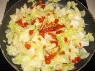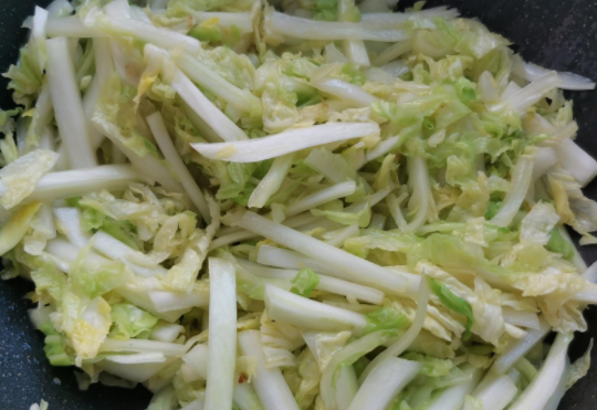 6、炒肉片的油留锅里,下白菜翻炒至变软。