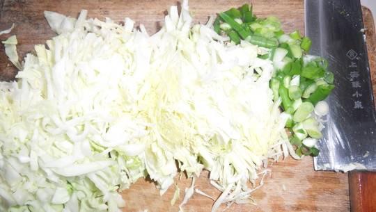 1、准备材料:饵块500克、白菜300克、肉180克、葱2根、剁椒适量、生抽1勺、淀粉适量、盐和味精适量、料酒少许。