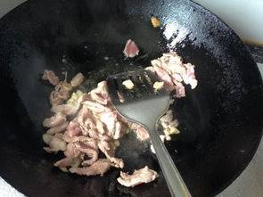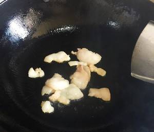 5、把油渣推一边,下肉片翻炒至变色断生铲起来备用。