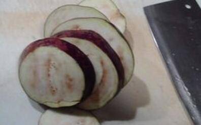 1、将圆茄去皮洗干净,一分为三,再对切成片。