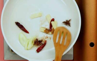 3、倒入食用油、葱花、姜片、八角、适量干辣椒、十三香,大火爆香。