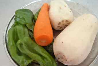 1、准备材料:莲菜3~5段、葱段适量、生姜3~5片、辣椒1~2个、胡萝卜3~5片。