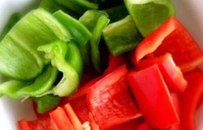 4、再倒入青椒红椒,胡萝卜丁翻炒均匀。