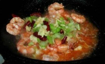 4、快速滑炒至虾仁变成红色;将葱、姜、蒜、干红椒段等放入锅中,用炒勺快速翻炒均匀。
