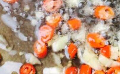 3、油下锅,放小红辣椒、大蒜,爆炒十秒。