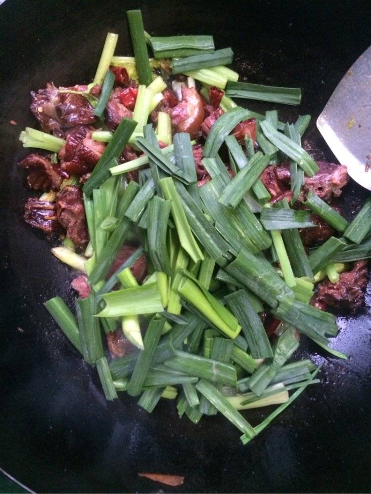 8、最后放入青蒜叶子,加少许酱油,蚝油,白糖翻炒均匀即可。