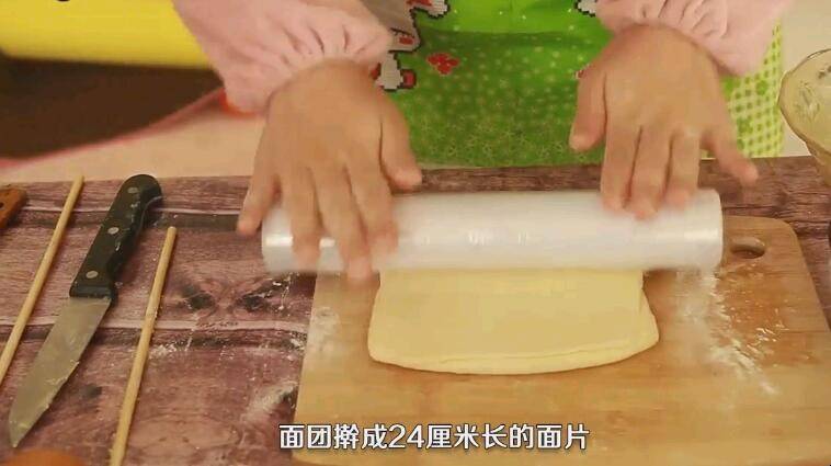 6、把面团转成90度,完成第二次三折和三次三折,面团擀成24厘米长的面片,在面片每两厘米做一个标记,切成五到六份。