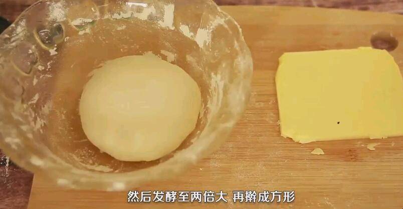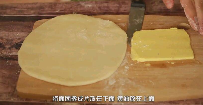 4、将面团擀成片放在下面,黄油放在上面,面片比黄油不要太大,刚好可把黄油片包住即可。