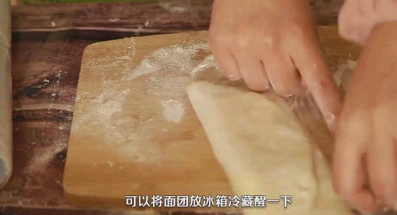 5、将包好的面团擀长,面团与黄油要步调一致,用三擀三折法,将面团放入冰箱冷藏醒一下。