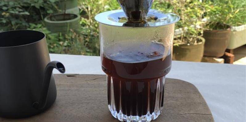 4、滴完后,加入第三次的热水,加满滤杯,咖啡汁滴完后,轻轻摇晃一下咖啡汁,以便使咖啡混合的便加均匀。