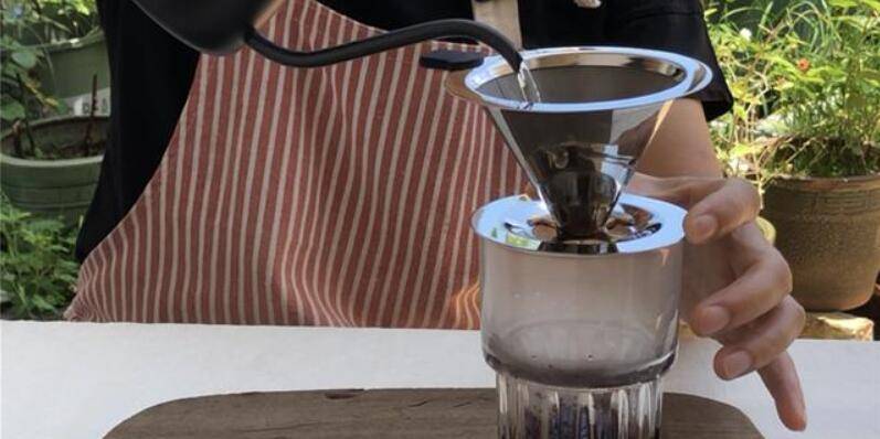 3、咖啡会透过滤杯慢慢滴入杯中,滴完后,加入第二次热水,这回加入咖啡壶滤杯的2/3量的热水。
