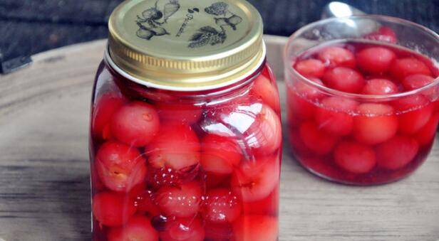 7、准备一个干净无水的罐头瓶子,把煮好的车厘子趁热装入瓶子中。