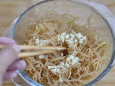 盛入干净容器里,撒上姜丝拌匀。依次倒入香醋、生抽、洒盐、糖、蒜,调匀即可。