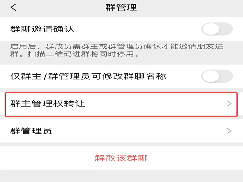 4、在群管理页面上,点击“群主管理权转让”,进入选择新群主页面。