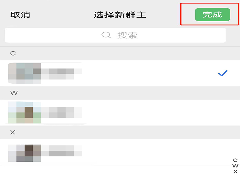 5、在选择新群主页面上,选择一位群成员,点击“完成”,即可将群主转让给该名群成员。
