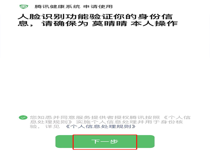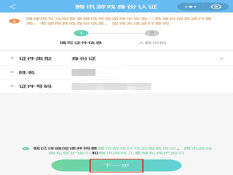 3、在身份验证页面上,输入个人的证件信息,即可点击“下一步”,进入人脸识别验证页面。