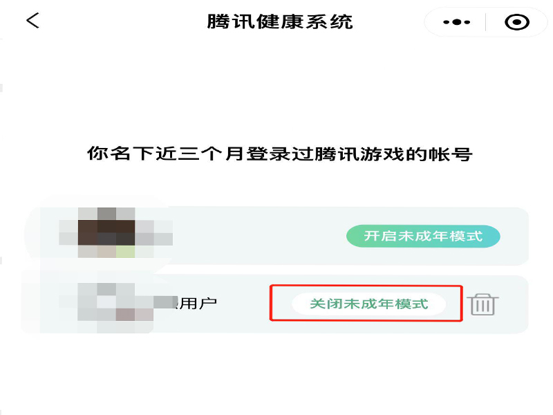 5、在近期登录的游戏账号页面上,点击“关闭未成年模式”,即可解除微信游戏的未成年限制。