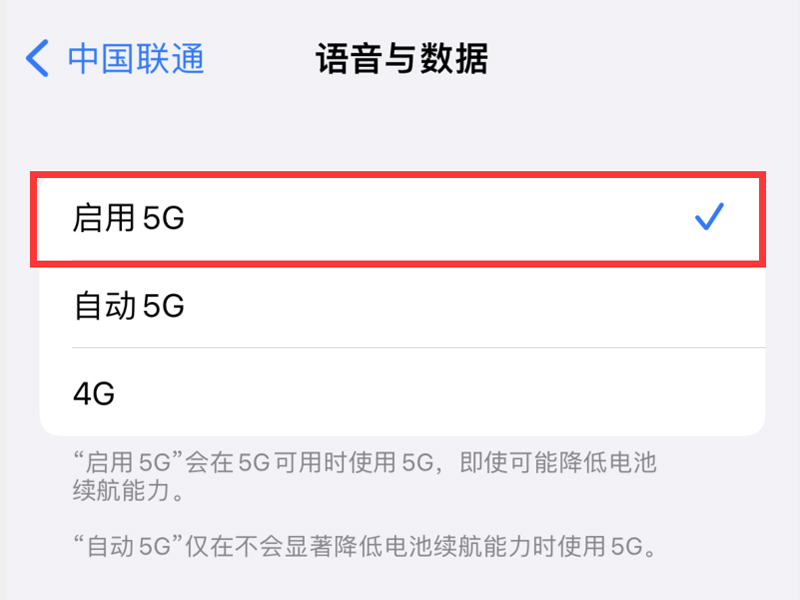3、点击“语音与数据”按钮,勾选“启用5g”即可打开5g网络。