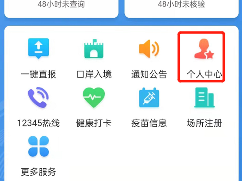 2、点击“防疫健康码”,再点击“查看防疫健康码”,点击“个人中心”。