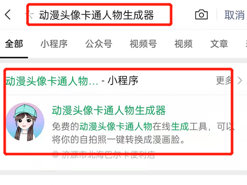 2、输入“动漫头像卡通人物生成器”进行搜索,点击“动漫头像卡通人物生成器”进入小程序。