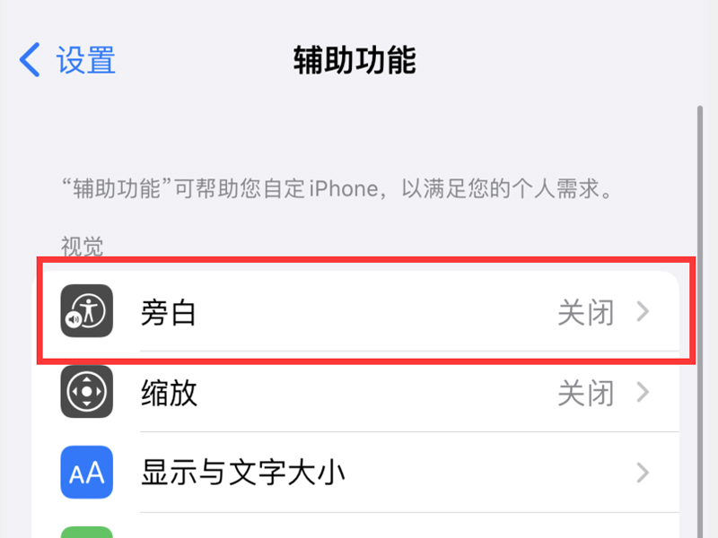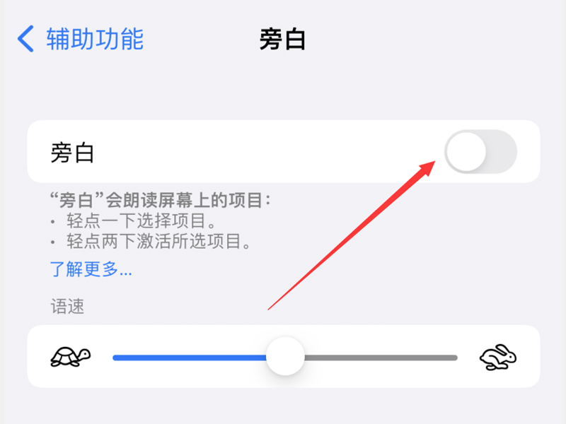 3、关闭“旁白”的开关,ipad就会恢复正常。