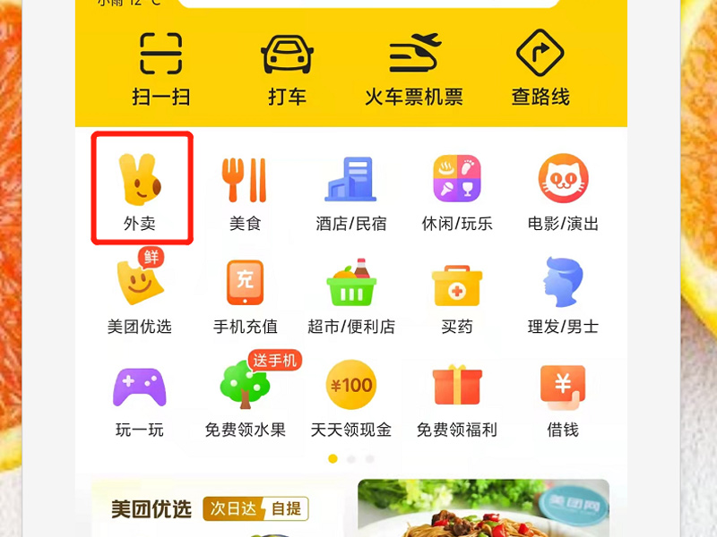 1、打开美团app,在首页上方点击外卖进入外卖界面。