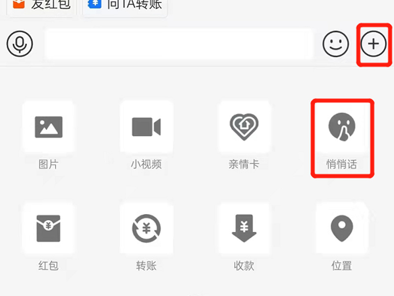 3、点击“+”号,再点击“悄悄话”,输入悄悄话发送。