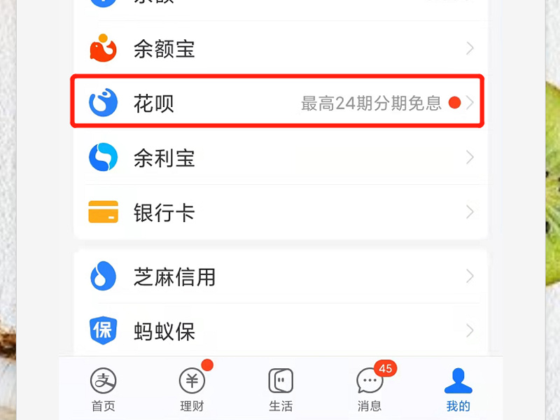 1、打开支付宝app,先点击下方的“我的”,再点击花呗进入花呗详情界面。
