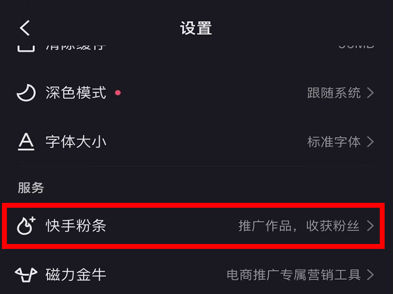 3、进入“设置”界面后,点击“快手粉条”,进入“快手粉条”界面。