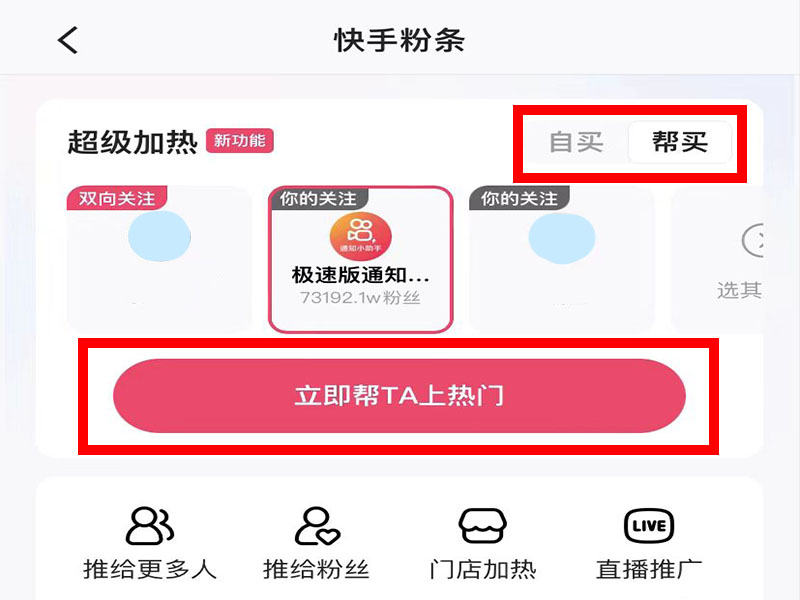 4、进入“快手粉条”界面后,选择自买或帮买后,点击“立即帮TA上热门”,进入“超级加热”界面。