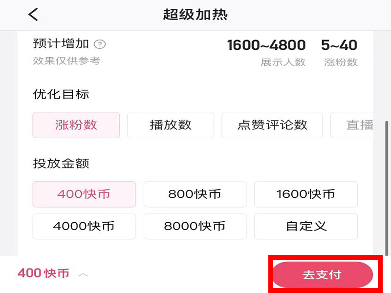 5、进入“超级加热”界面后,选择好目标、金额等,再点击“去支付”即可。