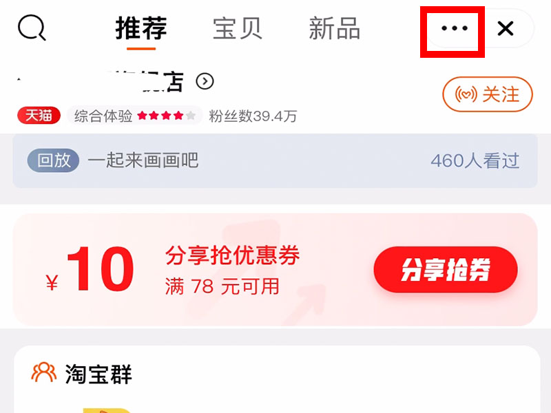 1、打开天猫,进入想要投诉的商家店铺主界面,点击右上角的“…”,进入“功能栏”界面。