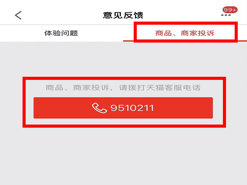 3、进入“意见反馈”界面后,点击“商品、商家投诉”,再点击下方的电话号码进行电话投诉即可。