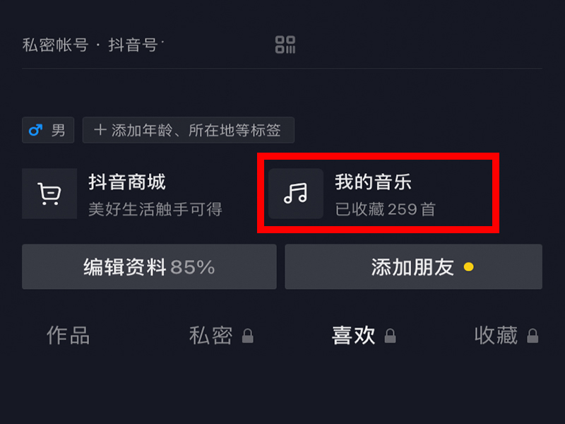 1、打开抖音,点击进入“我”的界面,再点击“我的音乐”,进入“我的收藏”界面。