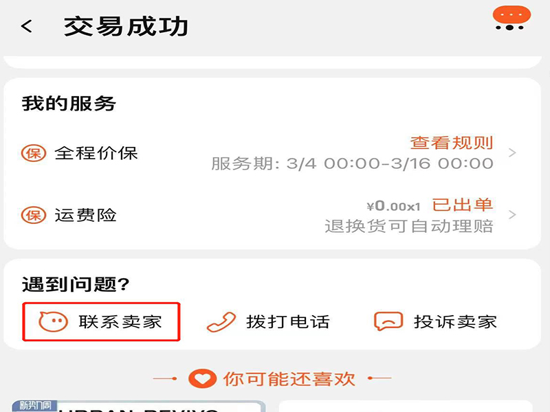 3、在订单详情页面上,点击“联系卖家”,进入与客服的对话界面。