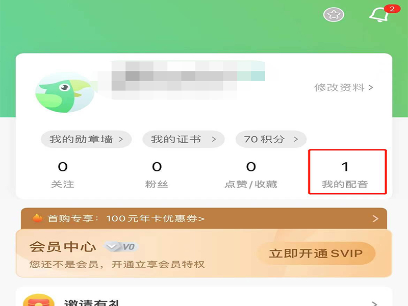 1、打开英语趣配音app,在我的个人页面上,点击“我的配音”,进入我的配音页面。
