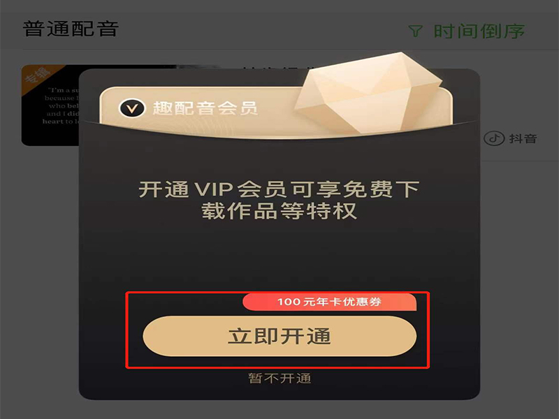 2、在我的配音页面上,选择导出的配音视频,点击“下载”,即会弹出需要开通会员才可享免费下载的提示窗口。