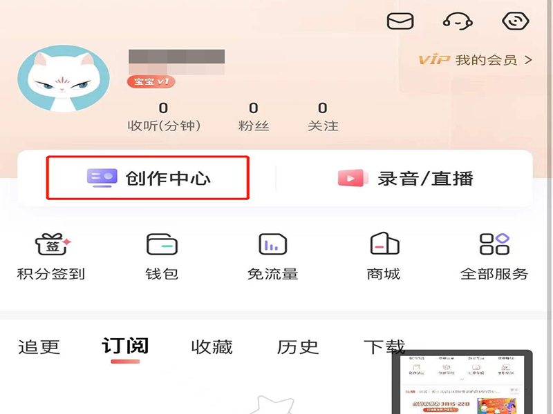 1、打开喜马拉雅app,在我的个人页面上 ,点击“创作中心”,进入创作中心页面。