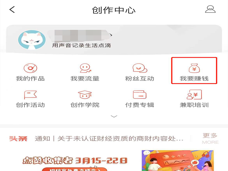 2、在创作中心页面上,点击“我要赚钱”,进入我要赚钱页面。