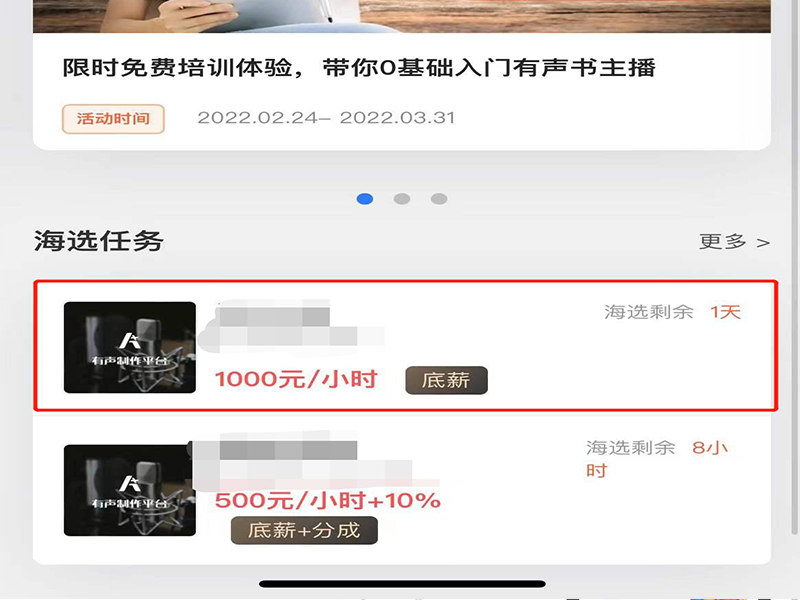 4、在喜马拉雅有声制作平台上,找到海选任务,选择擅长的配音内容,点击进入配音任务页面。