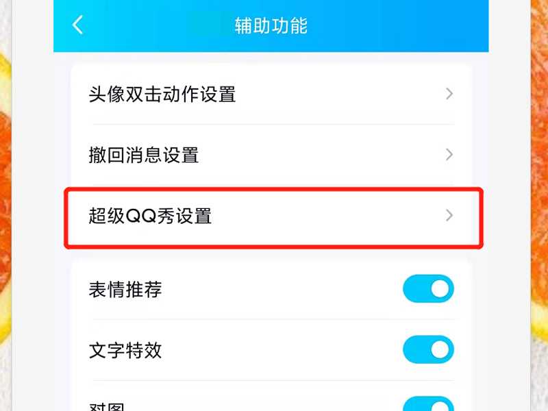 3、进入辅助功能设置界面后,选择超级QQ秀设置。