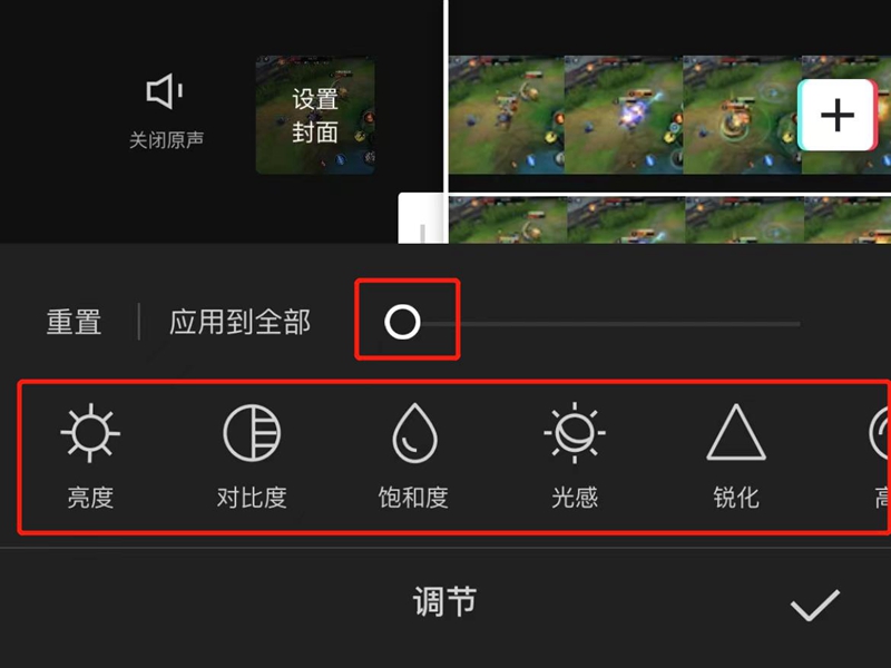 4、选择时间轴上需要调色的视频,点击调节即可对视频进行调色。