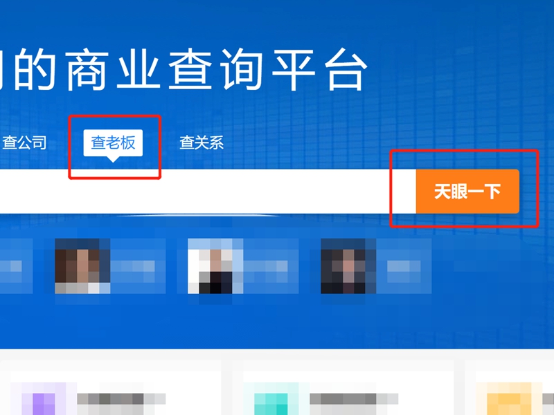 2、将搜索范围切换至查老板,输入对象姓名,点击天眼一下即可查询到对象的信息。