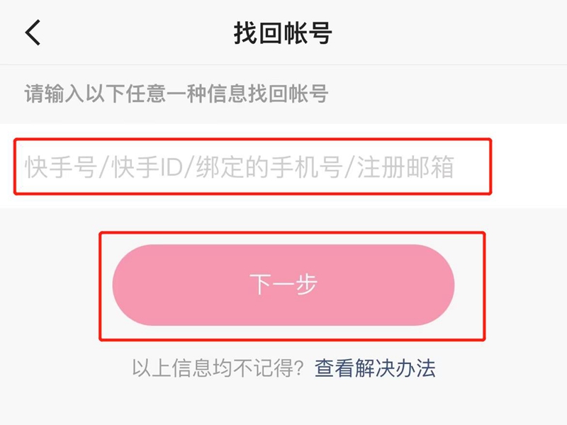 2、点击找回账号,输入快手号/快手ID/绑定的手机号/注册邮箱任一资料,点击下一步。
