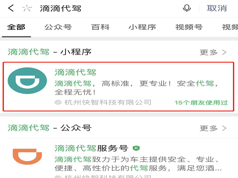 1、打开微信app,在微信搜索栏中搜索滴滴代驾,点击进入“滴滴代驾”小程序。